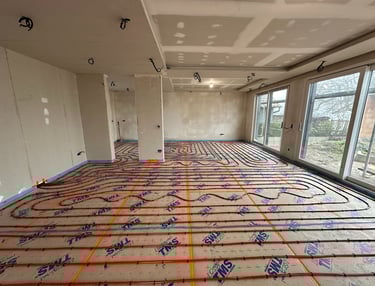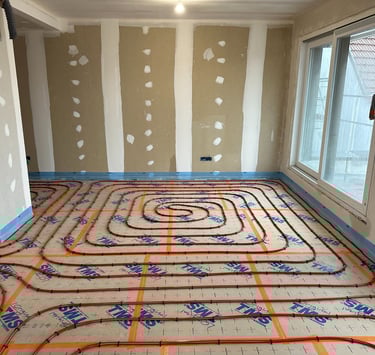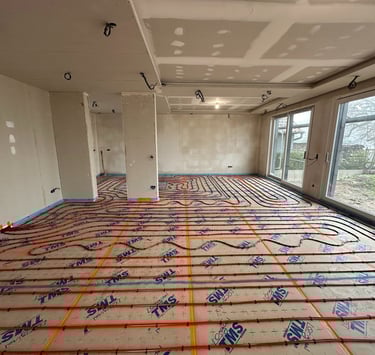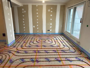 Installation de l'isolant de sol TMS et des circuits hydrauliques du plancher chauffant réversible.