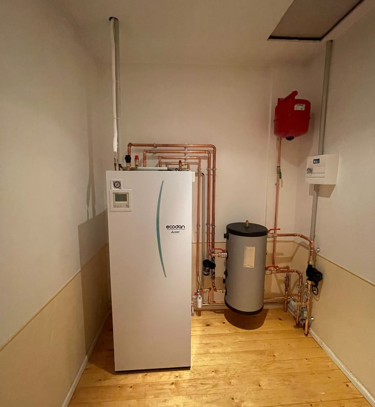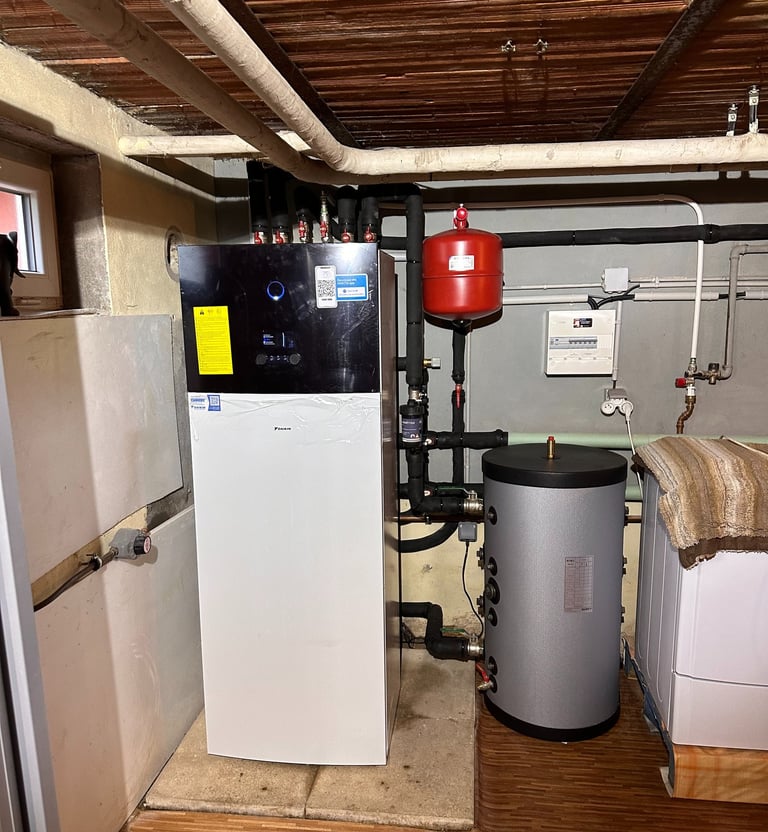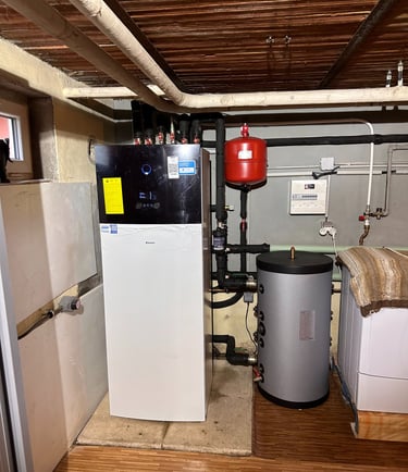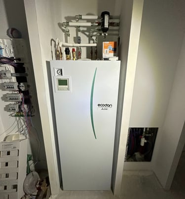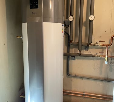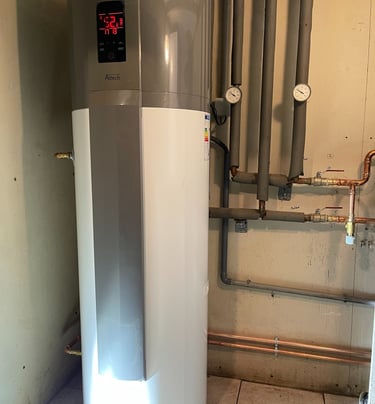 Installation d'une pompes à chaleur air/eau duo 200L pour le chauffage central et la production d'eau chaude sanitaire en zone chauffée.