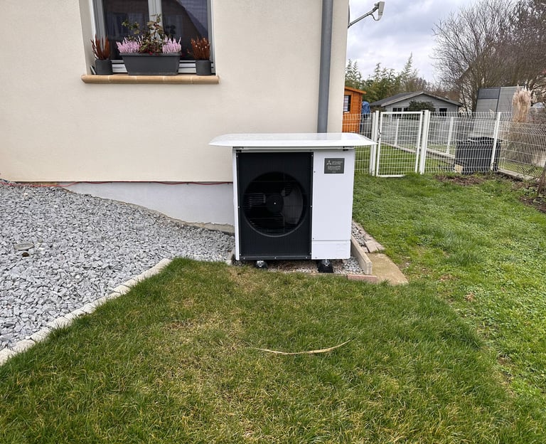 Installation d'une unité extérieure de pompe à chaleur air/eau duo 200L pour le chauffage central et la production d'eau chaude sanitaire.